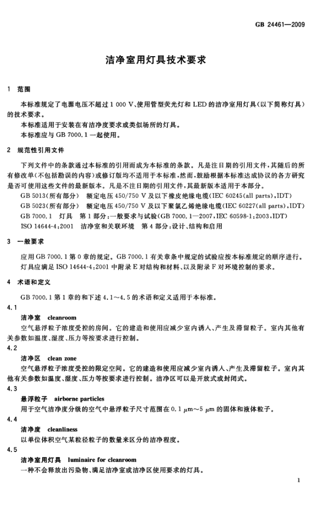 潔凈室用燈具技術(shù)要求規(guī)范標(biāo)準(zhǔn) GB24461-2009 (燈具技術(shù)要求)